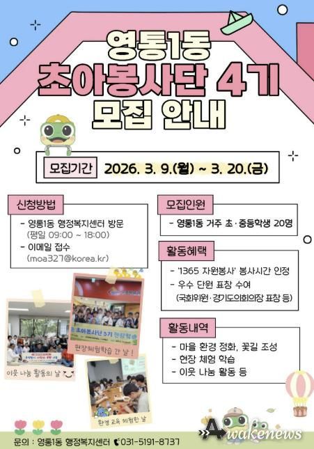 어웨이크뉴스 오경하 기자 | 영통구 영통1동은 영통1동 주민자치회가 지역 청소년의 자원봉사 참여 확대를 위해 3월 9일부터 3월 20일까지 관내 초·중학생을 대상으로 ‘초아봉사단 4기’ 단원을 모집한다고 밝혔다.
