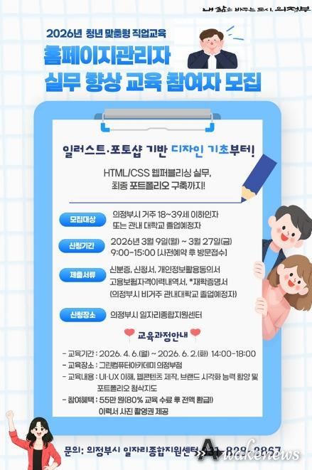 어웨이크뉴스 오경하 기자 | 의정부시는 사회에 첫발을 내딛는 청년과 전직 희망자를 위해 4월 6일부터 6월 2일까지 9주간 ‘홈페이지 관리자 실무 향상 교육’을 운영한다.