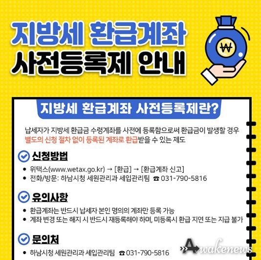 어웨이크뉴스 오경하 기자 | 하남시는 납세자에게 지방세 환급금(더 낸 세금)을 보다 신속하고 편리하게 지급하기 위해 ‘지방세 환급계좌 사전등록제’를 적극 운영한다고 밝혔다.