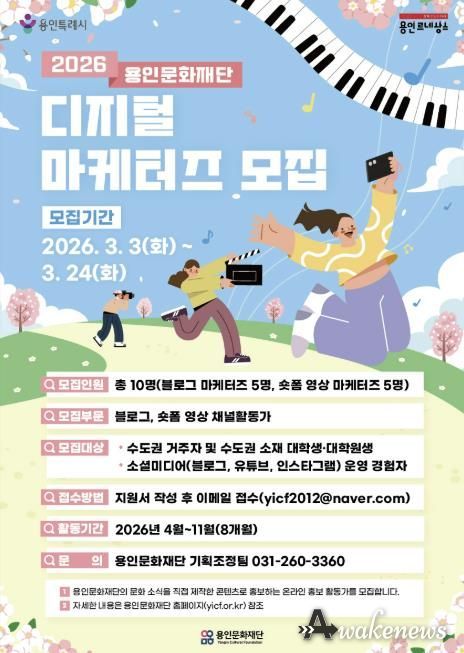 어웨이크뉴스 오경하 기자 | 용인문화재단은 오는 3월 24일까지 재단의 다양한 문화·예술사업을 시민의 시선으로 홍보하기 위한 ‘2026 용인문화재단 디지털 마케터즈’를 모집한다고 밝혔다.