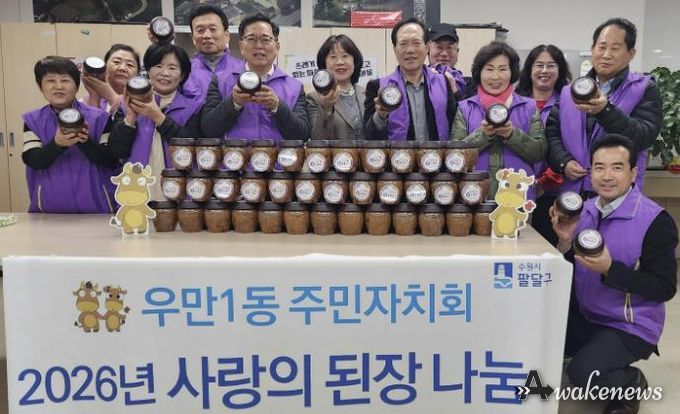 어웨이크뉴스 오경하 기자 | 수원시 팔달구 우만1동 주민자치회는 지난 9일, 우만1동 행정복지센터에서 지난해 전통 방식으로 담가 숙성한 된장을 관내 취약계층에게 전달하는 ‘사랑의 된장 나눔 행사’를 진행했다.