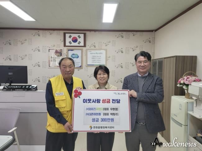 어웨이크뉴스 오경하 기자 | 연천군 소재 ㈜와이즈이앤지와 ㈜더존이엔엠은 지난 9일 연천읍 행정복지센터를 방문해 관내 어르신들을 위한 경로잔치 준비에 써달라며 성금 300만원을 기탁했다.