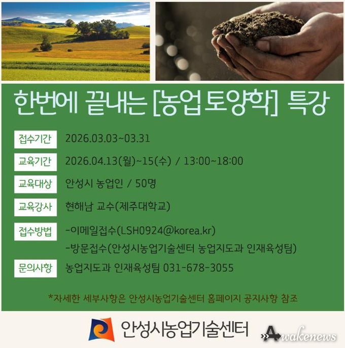 어웨이크뉴스 오경하 기자 | 안성시농업기술센터가 오는 31일까지 토양 분야 권위자인 제주대학교 현해남 교수를 초청해 ‘농업 토양학 특강’ 교육생을 모집한다.