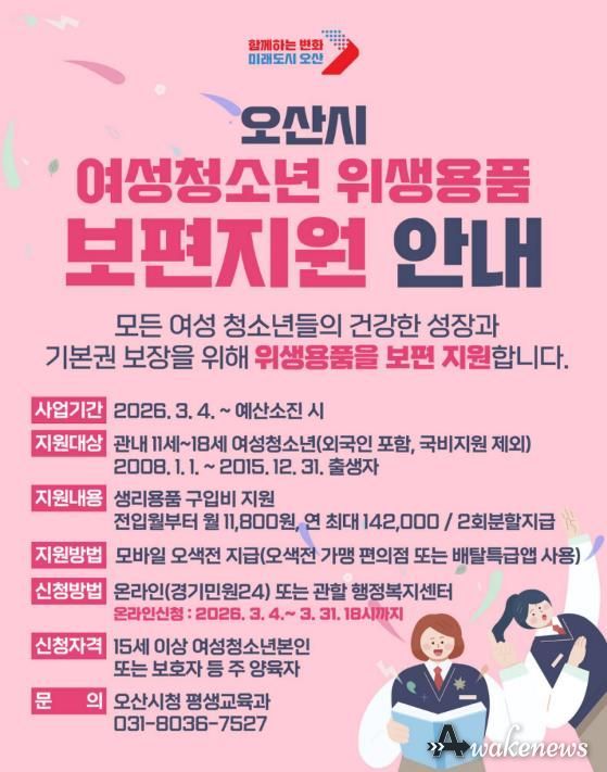 어웨이크뉴스 오경하 기자 | 오산시는 관내 11세부터 18세까지의 여성청소년을 대상으로 '여성청소년 위생용품 보편지원 사업'을 추진한다고 밝혔다.
