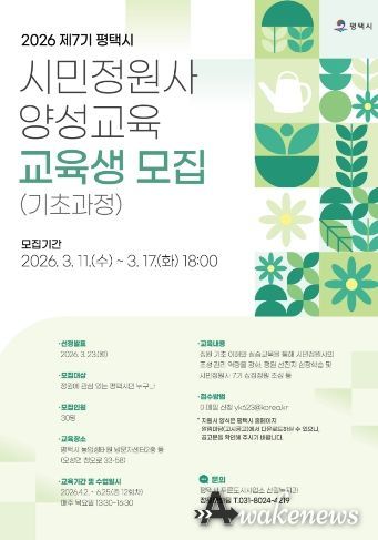 어웨이크뉴스 오경하 기자 | 평택시는 ‘제7기 평택시 시민정원사 양성과정(기초)’에 함께할 시민 교육생을 모집한다고 밝혔다.