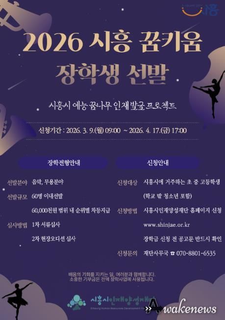 어웨이크뉴스 오경하 기자 | 시흥시인재양성재단은 지역 내 예능 분야 인재를 발굴ㆍ육성하기 위해 ‘2026년 시흥 꿈키움 장학생’을 60명 이내로 선발한다.