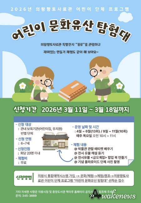 어웨이크뉴스 오경하 기자 | 의왕시 향토사료관이 오는 4월부터 6월, 9월부터 10월 매주 목요일에 어린이 단체 체험프로그램 ‘어린이 문화유산 탐험대’를 운영한다.