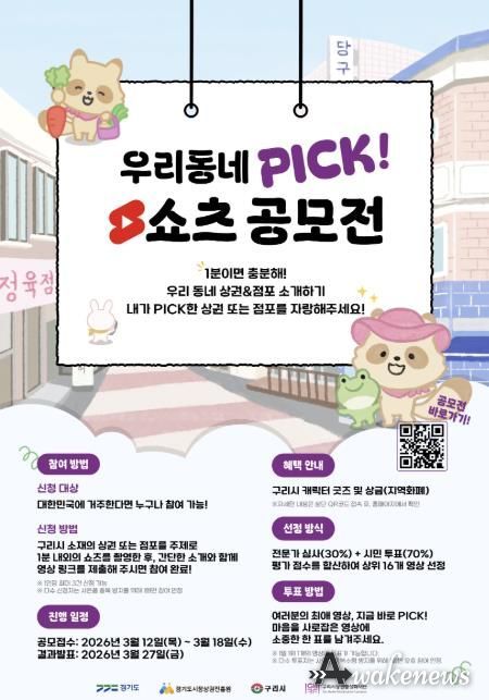 어웨이크뉴스 오경하 기자 | 구리시상권활성화재단은 구리시 상권의 다양한 매력을 알리기 위해 ‘우리동네 PICK! 시민캠페인’ 쇼츠(Shorts) 공모전을 개최하고, 오는 3월 12일부터 18일까지 공모 접수를 진행한다고 밝혔다.