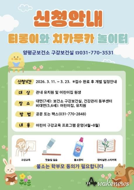 어웨이크뉴스 오경하 기자 | 양평군은 어린이집 및 유치원 아동을 대상으로 올바른 구강관리 습관 형성과 구강건강 증진을 위해 ‘티롱이와 치카푸카 놀이터’ 프로그램을 4월부터 8월까지 운영한다고 밝혔다.