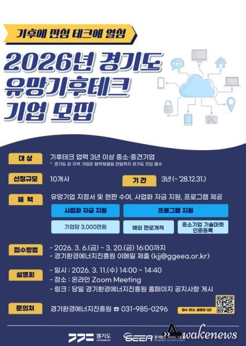 어웨이크뉴스 오경하 기자 | 경기도와 경기환경에너지진흥원이 기후위기 대응을 선도할 혁신 기술 보유 기업을 발굴하기 위해 오는 3월 20일까지 ‘2026년 경기도 유망 기후테크 기업’ 10곳을 모집한다.