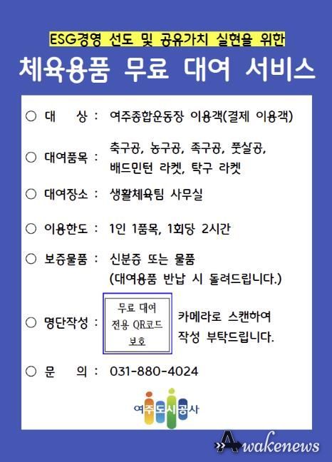 어웨이크뉴스 오경하 기자 | 여주도시공사는 여주종합운동장 이용 시민들의 편의를 높이기 위해, 2023년부터 시행해 온 ‘체육용품 무료대여 서비스’를 오는 2026년 4월 1일부터 대폭 확대 운영한다.