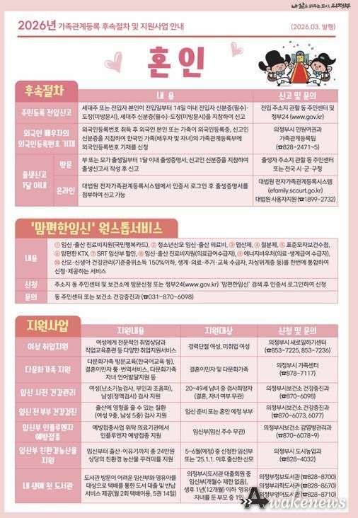 어웨이크뉴스 오경하 기자 | 의정부시는 3월 12일부터 ‘가족관계등록 신고 후속절차 및 지원사업 안내문’을 시청 민원실과 각 동 행정복지센터를 통해 시민들에게 제공한다.