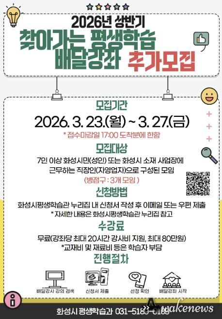 어웨이크뉴스 오경하 기자 | 화성특례시는 시민의 다양한 학습 수요를 반영한 맞춤형 평생학습 프로그램 운영을 위해 ‘2026년 상반기 찾아가는 평생학습 배달강좌’를 추가 모집한다고 밝혔다.