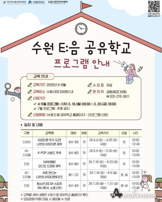 수원시미디어센터는 ‘2026년 수원 E:음 공유학교’ 지역맞춤형 기관 연계 프로그램 운영 기관으로 선정되어, 오는 4월부터 디자인, 사운드, 스피치 등 다채로운 미디어 교육을 본격 가동한다.