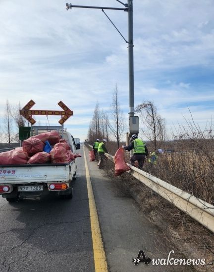 시는 지난 2월 26일 시작하여 3월 15일까지 관내 주요 국도 구간을 대상으로 환경 정비를 실시 중이며, 현재 교차로 및 비탈면 등에서 생활 쓰레기와 불법 투기 폐기물 등 1톤 마대 80여 개 분량의 폐기물을 수거하는 등 국도변 청소 작업을 하고 있다.