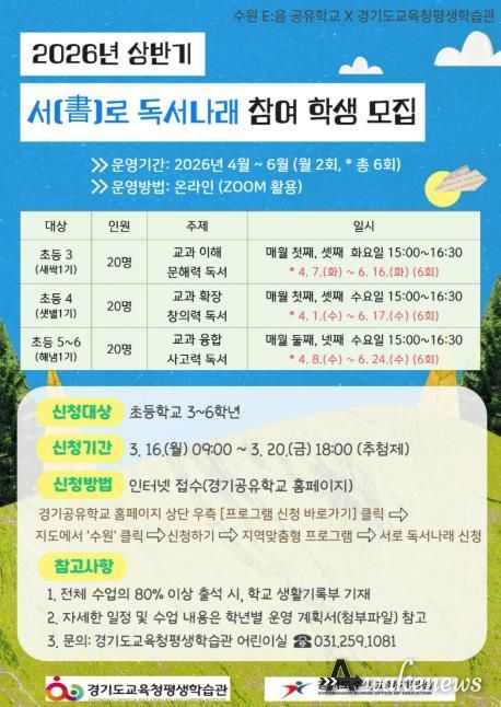어웨이크뉴스 오경하 기자 | 경기도교육청평생학습관이 수원교육지원청과 함께 초등학생의 문해력과 사고력 향상을 위한 경기공유학교 ‘서(書)로 독서나래’를 운영한다.