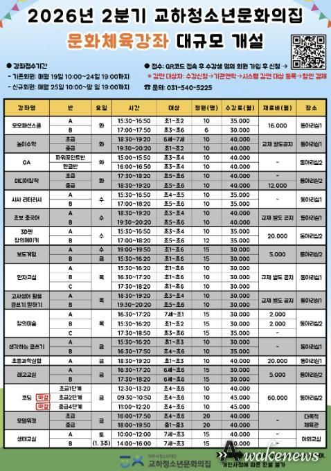어웨이크뉴스 오경하 기자 | (재)파주시청소년재단 교하청소년문화의집은 2026년을 맞아 지역 청소년들의 다채로운 꿈과 잠재력을 폭넓게 지원하기 위해 문화체육강좌를 대규모로 증설하고 새롭게 단장했다.