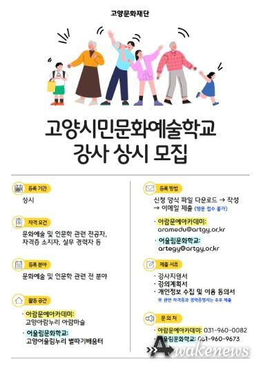 어웨이크뉴스 오경하 기자 | 고양문화재단은 시민들에게 참신하고 수준 높은 문화예술교육 서비스를 제공하기 위해 ‘고양시민문화예술학교’(아람문예아카데미 및 어울림문화학교) 강사 인력풀(POOL)을 상시 모집한다.