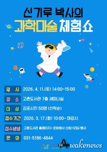 어웨이크뉴스 오경하 기자 | 김포시 고촌도서관은 4월 11일 오후 2시 초등학생 3~6학년을 대상으로 '신기루 박사의 과학마술 체험쇼'를 운영한다.