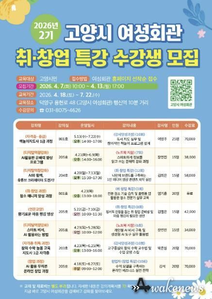 어웨이크뉴스 오경하 기자 | 고양특례시 여성회관이 오는 4월 7일부터 2026년 취·창업 특강(2기) 수강생을 모집한다.