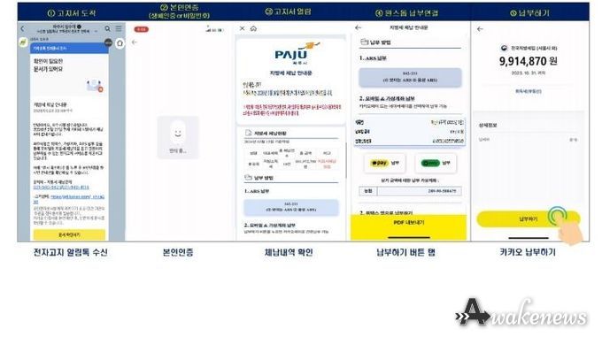 어웨이크뉴스 오경하 기자 | 파주시는 지방세 체납액 징수율을 제고하기 위해 도입한 '체납 안내 카카오 알림톡 모바일 전자고지 서비스'가 뚜렷한 성과를 거두고 있다.