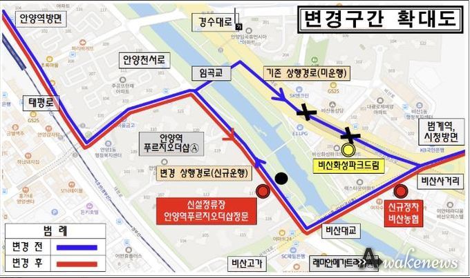 반면, 안양역에서 범계역 방면 운행 시 정차하던 기존 '비산화성파크드림' 정류장은 노선 효율화를 위해 더 이상 경유하지 않는다. 기존 이용객은 인접한 '비산농협'이나 '비산사거리.이마트' 정류장을 이용할 수 있다.