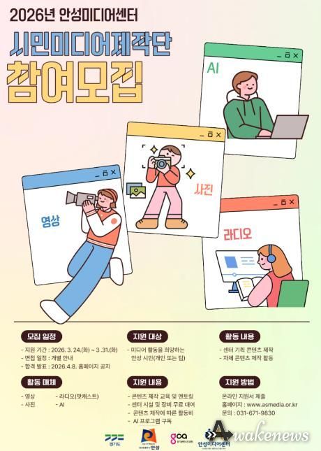 어웨이크뉴스 오경하 기자 | 안성시 미디어센터는 시민과 지역 모임(단체)의 미디어 콘텐츠 제작 활동을 지원하는 ‘시민미디어제작단’ 사업 참여자를 오는 3월 31일까지 모집한다.