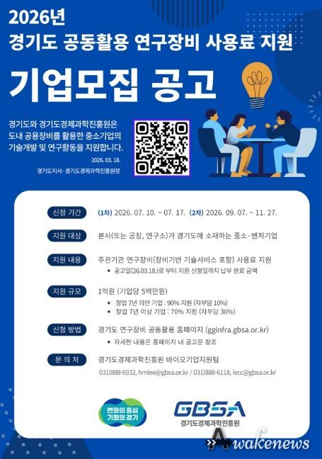 어웨이크뉴스 오경하 기자 | 경기도와 경기도경제과학진흥원이 도내 중소·벤처기업의 연구개발(R&D) 경쟁력 강화를 위해 ‘2026년 경기도 공동활용 연구장비 사용료 지원 사업’을 추진한다.