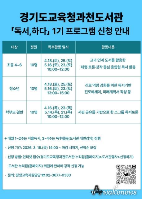어웨이크뉴스 오경하 기자 | 경기도교육청과천도서관이 지역주민의 독서 역량 강화와 융합적 사고력 함양을 위해 '2026년 독서, 하다’프로그램을 운영한다.