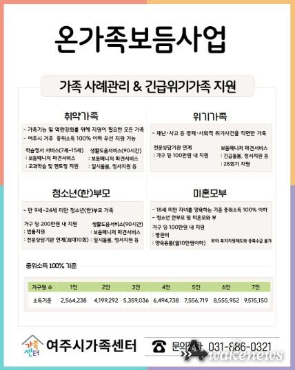 어웨이크뉴스 오경하 기자 | 여주시가족센터는 복합적인 어려움을 겪는 가족을 발굴하고 지원하기 위해, 2026년 ‘취약·위기가족 지원사업(온가족보듬사업)’을 예년보다 확대하여 본격 가동한다고 밝혔다.