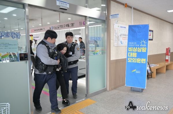 어웨이크뉴스 오경하 기자 | 여주시는 19일 민원토지과에서 여주경찰서와 함께 ‘민원실 비상 상황 대응 모의훈련’을 실시했다.