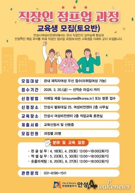 어웨이크뉴스 오경하 기자 | 안성시에서 운영 중인 안성시여성비전센터에서는 토요반으로 직장인들의 직무능력 향상 교육을 위한 점프업 과정을 진행한다고 밝혔다. 교육과정은 재직자들이 가장 많이 사용하는 정보화 프로그램 3개 과정으로 한글(HWP), 엑셀(XLSX), 캡컷(CAPCUT)을 활용하여 실무교육을 진행한다.