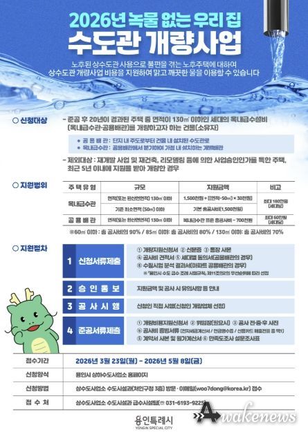 어웨이크뉴스 오경하 기자 | 용인특례시는 오는 5월 8일까지 ‘녹물 없는 우리 집 수도관 개량사업’ 참여 가구를 모집한다고 24일 밝혔다.