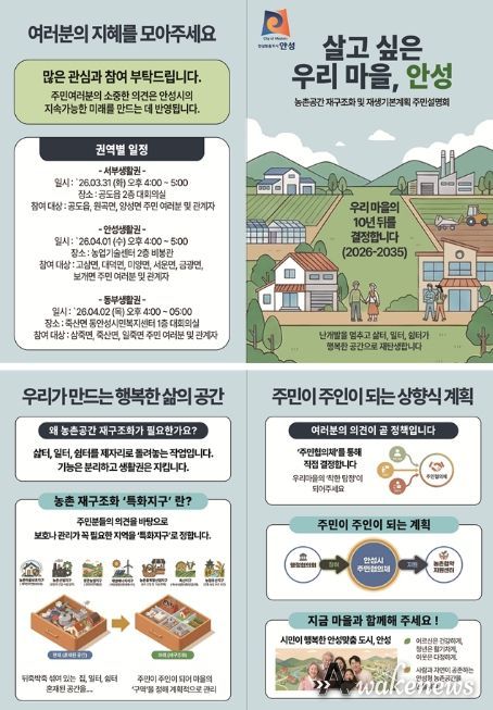 어웨이크뉴스 오경하 기자 | 안성시는 농촌 지역의 체계적인 정비와 지속 가능한 발전을 위한 ‘농촌공간 재구조화 및 재생 기본계획’ 수립과 관련하여, 지역 주민의 생생한 목소리를 듣기 위한 주민설명회를 개최한다고 밝혔다.