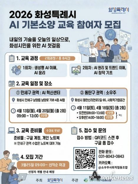 어웨이크뉴스 오경하 기자 | 화성특례시가 시민이 직접 AI 교육을 확산하는 선순환 생태계를 조성하고자 ‘2026년 AI 시민 리더 양성 교육’ 참여자를 모집한다.