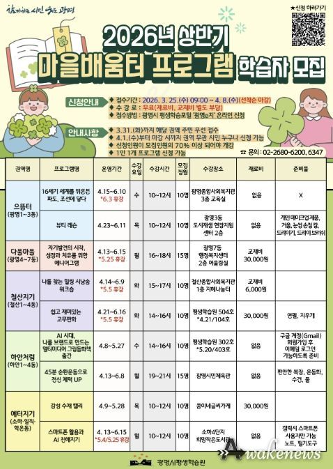어웨이크뉴스 오경하 기자 | 광명시가 시민들이 생활권 내에서 평생학습을 누릴 수 있도록 ‘2026년 상반기 권역별 마을배움터 프로그램’ 수강생을 오는 4월 8일까지 모집한다.