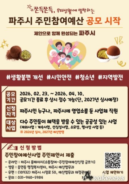 어웨이크뉴스 오경하 기자 | 파주시는 2027년도 예산 편성에 반영할 주민참여예산 시민 제안을 오는 4월 10일까지 접수한다.