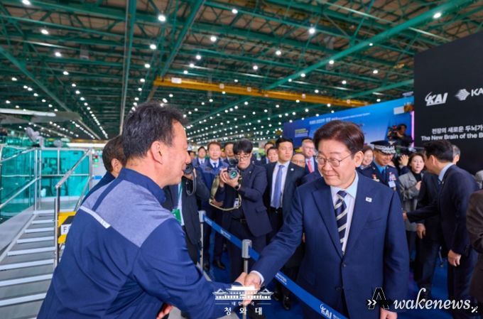 어웨이크뉴스 오경하 기자 | 이재명 대통령은 25일 오후 한국항공우주산업(KAI)에서 열린 KF-21 양산 1호기 출고식에 이어 고정익 생산 현장을 시찰했다.