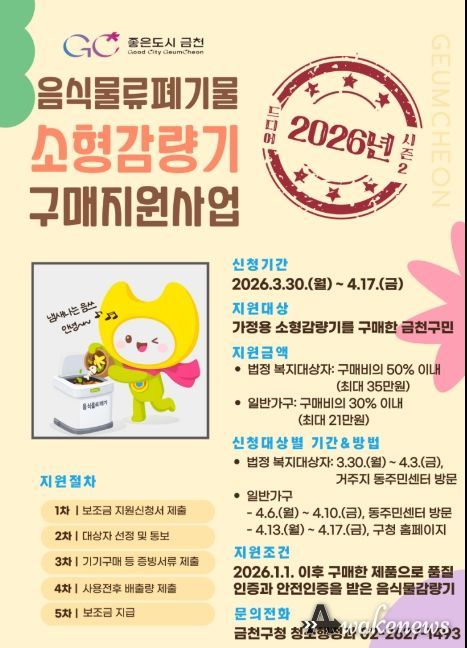 지원 대상은 사업 공고일(3월 23일) 기준 주민등록상 거주지가 서울특별시 금천구이고, 2026년 1월 1일 이후 감량기를 구매했거나 구매 예정인 경우 신청할 수 있다.