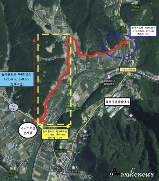 북101호선은 북면 제령리 목동교회 인근에서 소법리 골말교 인근까지 이어지는 총 2.4km 구간이다. 1단계 사업은 2023년 12월 준공과 함께 도로를 개통했으며, 군은 2024년부터 2단계 구간 노선 지정을 위한 행정절차를 진행해 왔다. 이어 올해 1월 보상 협의를 완료하면서 4월 공사 착공을 앞두게 됐다.