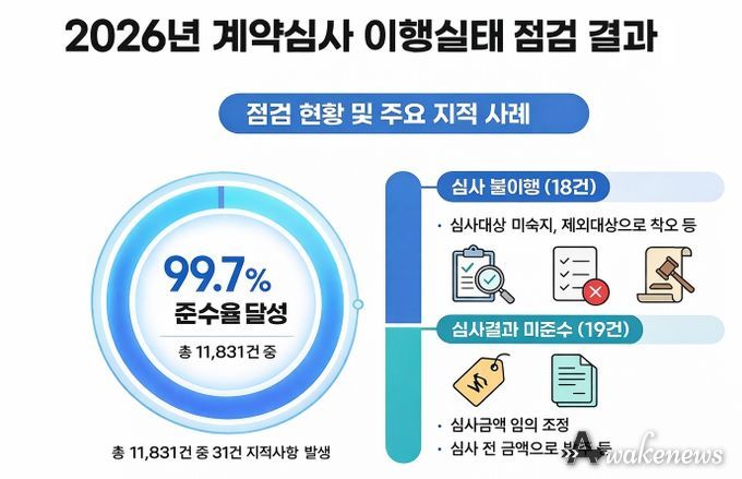 어웨이크뉴스 오경하 기자 | 경기도 감사위원회는 도 본청과 시군, 공공기관 등 77개 기관을 대상으로 ‘계약심사 이행실태’를 점검한 결과, 99.7%의 높은 절차 준수율을 기록했다고 30일 밝혔다.