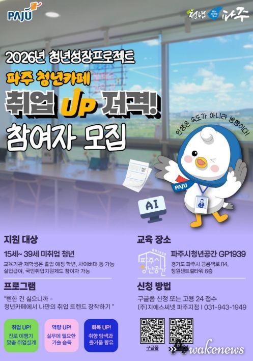 어웨이크뉴스 오경하 기자 | 파주시는 고용노동부가 추진하는 2026년 청년성장프로젝트의 일환으로 마련한 청년카페 기반 맞춤형 취업지원 사업 ‘취업(UP)저격!’을 본격 운영한다고 밝혔다.