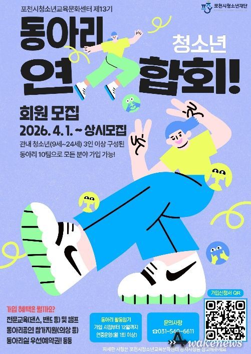 어웨이크뉴스 오경하 기자 | 포천시청소년재단 포천시청소년교육문화센터는 지역 청소년의 자율적이고 창의적인 활동을 지원하기 위해 ‘제13기 청소년동아리연합회’ 회원을 모집한다.