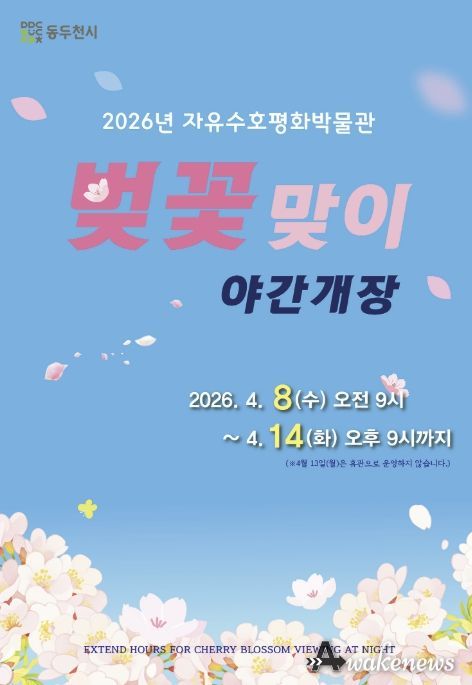 어웨이크뉴스 오경하 기자 | 동두천시 자유수호평화박물관은 오는 4월 8일부터 14일까지 6일간(4월 13일 월요일 정기 휴관) 벚꽃 개화기를 맞아 자유수호평화박물관 개관 시간을 기존 오후 6시에서 오후 9시까지 연장 운영한다고 밝혔다.