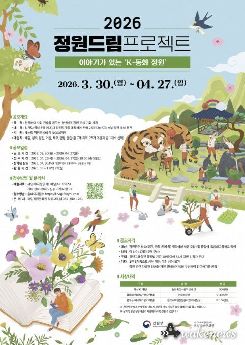 ‘2026 정원드림프로젝트’는 청년 정원 인재를 발굴하고 실습 중심의 정원 조성 기회를 제공하는 프로그램이다. 희망자는 팀 단위로 지원할 수 있으며, 선발된 팀에는 약 5,000만 원의 정원 조성비가 지원된다. 공모는 3월 30일부터 4월 27일까지 진행되며, 접수는 4월 23일부터 4월 27일까지 국립정원문화원을 통해 이루어진다.