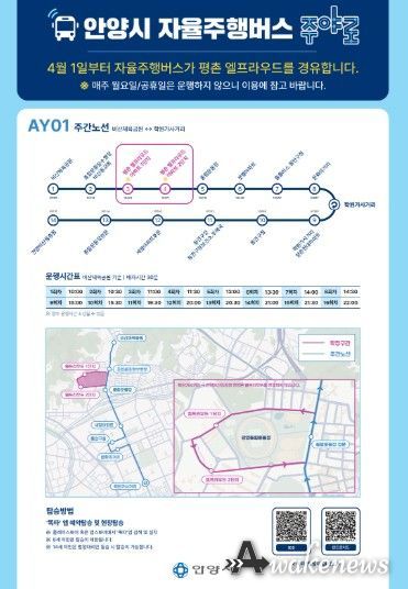 어웨이크뉴스 오경하 기자 | 안양시는 1일 첫차부터 자율주행 버스 '주야로'의 주간 노선을 확대 운행한다고 밝혔다. 배차 간격이 단축되고 정류소가 추가되어 시민들의 대중교통 이용 편의가 개선될 전망이다.