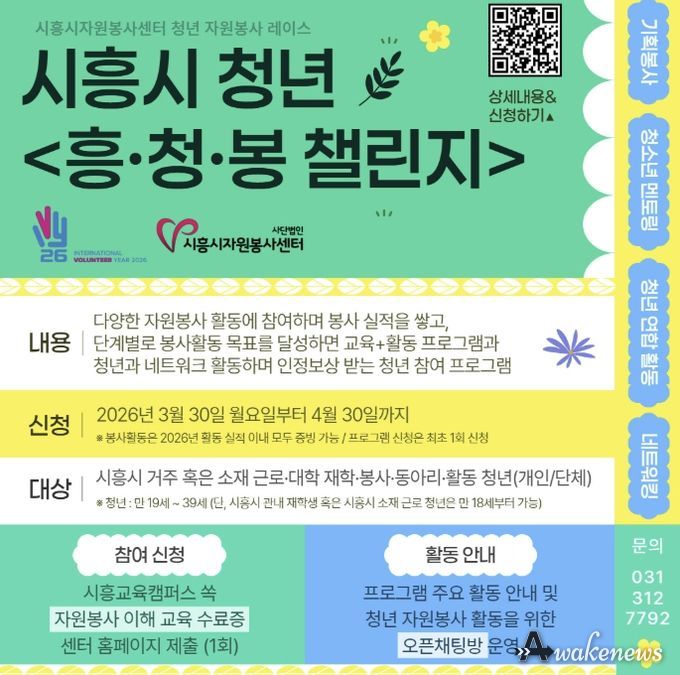 어웨이크뉴스 오경하 기자 | 시흥시자원봉사센터는 청년들의 자발적인 자원봉사 참여 확대와 지속 가능한 참여 기반 조성을 위해 청년 자원봉사 레이스 ‘흥·청·봉 챌린지’를 4월부터 12월까지 운영한다.
