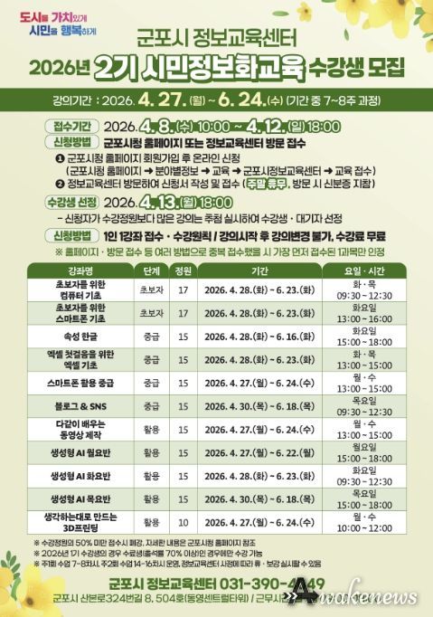 수강신청은 2026년 4월 8일 오전 10시부터 4월 12일 오후 6시까지 가능하며, 군포시청 홈페이지 또는 군포시 정보교육센터(산본로324번길 8, 504호, 주말 휴무) 방문을 통해 신청할 수 있다.