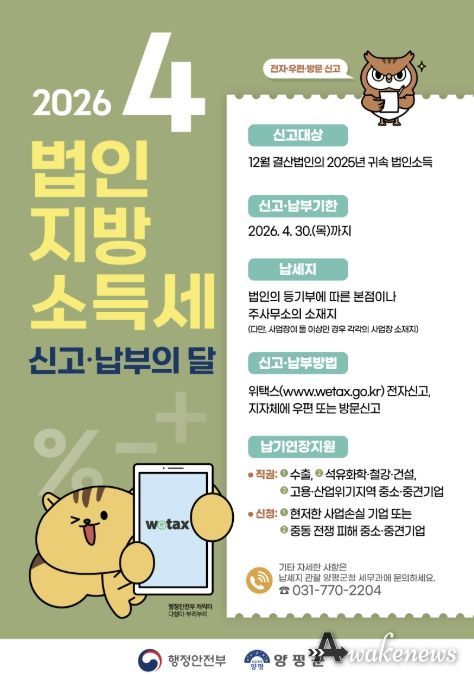 어웨이크뉴스 오경하 기자 | 양평군은 ‘4월 법인지방소득세 확정신고·납부의 달’을 맞아 오는 4월 30일까지 법인지방소득세 신고·납부기간을 운영한다고 밝혔다.