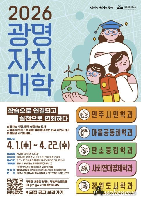 어웨이크뉴스 오경하 기자 | 광명시가 시의 핵심의제인 평생학습 마을리더 양성과정 ‘광명자치대학’ 2026년 신입생 125명을 오는 22일까지 모집한다.